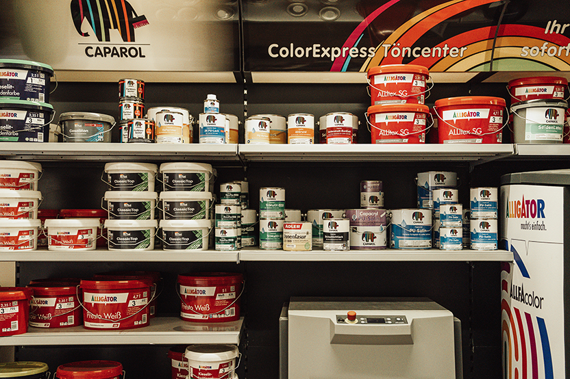 Sie möchten Ihre Wunschfarbe direkt mitnehmen? Kein Problem. Dank unserer eigenen Farbmischmaschine stellen wir individuelle Farbtöne sofort vor Ort her.